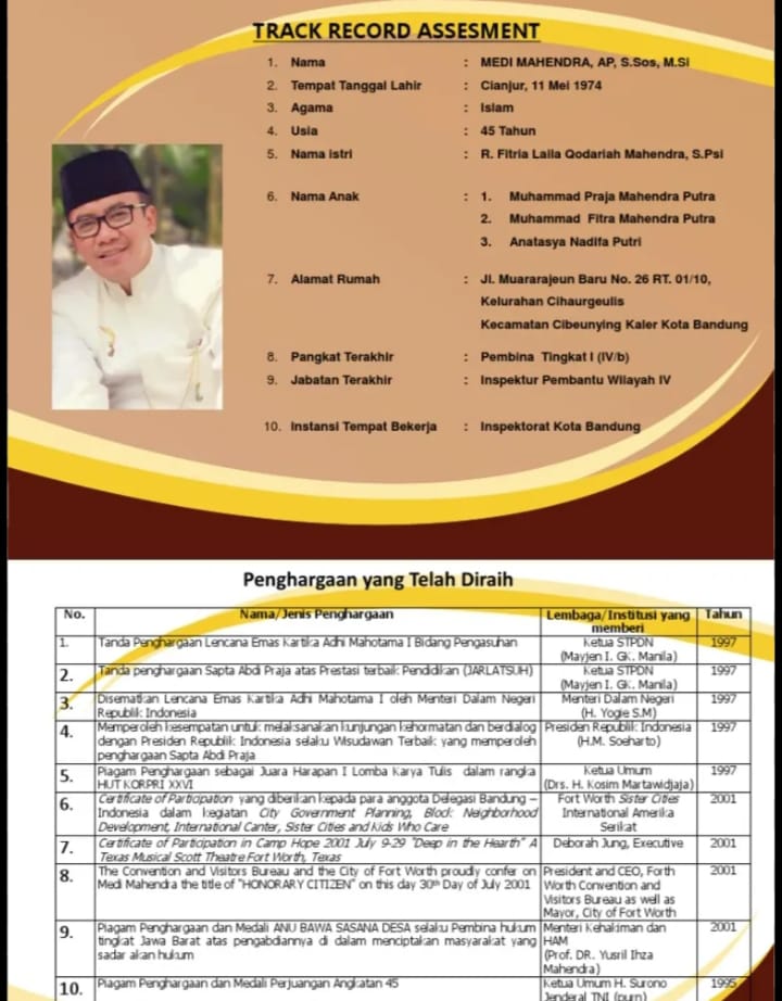 Dari Alm.H. Yogie SM (Mendagri) Lencana Emas Kartika Adhi Mahkotama I, wisudan terbaik STPDN dan memperoleh penghargaan Sapta Abdi Praja oleh Presiden RI ke-2 ( HM. Soeharto). Juara harapan I lomba karya tulis HUT Korpri XXVI, dan masih banyak lagi. **(RM/BNN)