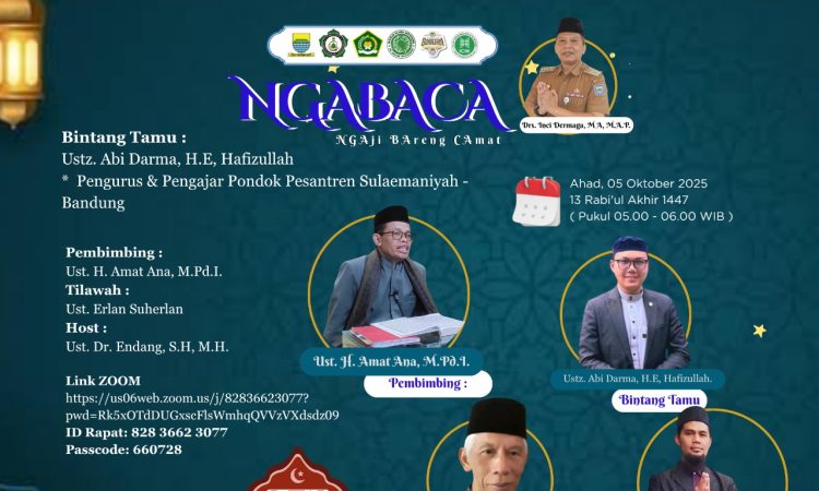 Bandung, bandungpos.id — Dalam upaya meningkatkan nilai keimanan dan ketaqwaan, Kecamatan Sukajadi KotaBandung gelar acara NGABACA (ngaji bareng camat Sukajadi, Drs. Inci Dermaga, M.A, M.A.P) secara online, Minggu (5/10/2025) mulai pukul 05.00-06.00 wib.